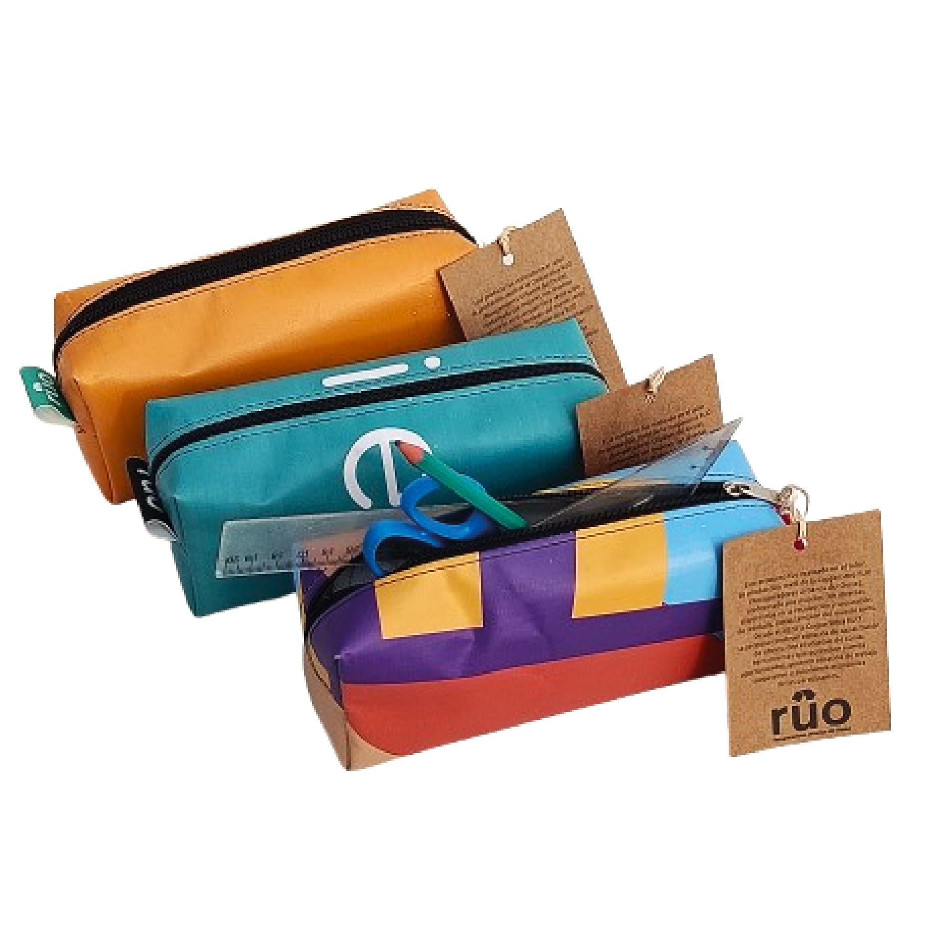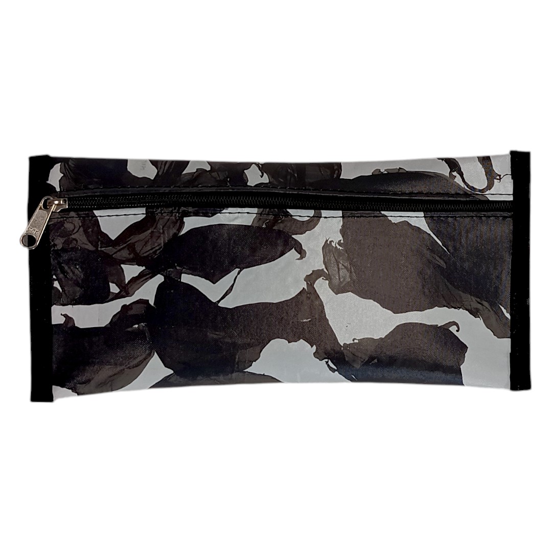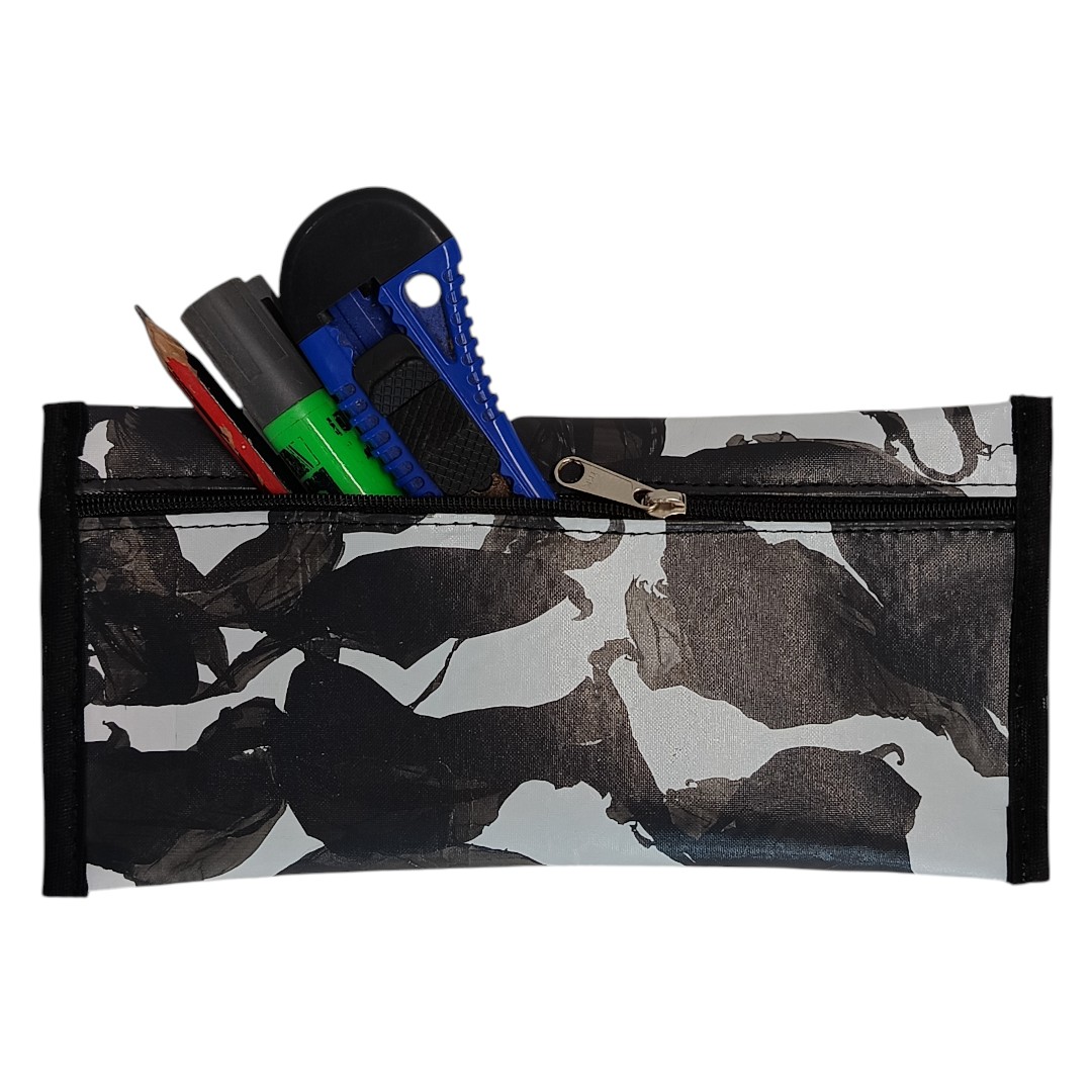 Cada cartuchera es única, con variaciones de color y textura propias del material recuperado, lo que refuerza su identidad sustentable y artesanal.